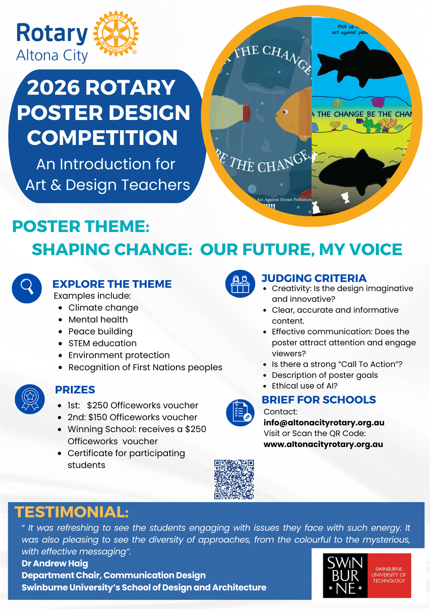 - Registrations by Schools are invited for the 2026 competition and Rotary will accept the first 8 schools that register, with a proposed limit of 40 posters (for judging by one panel), to be shared equally by Registered Schools.